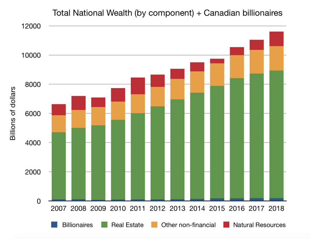 In 2007, the total wealth of all Canadians on the Forbes list was $110 billion Canadian dollars. In 2018, it was $194 billion. The net value of all real estate in Canada grew faster than the sum of all Canadian billionaires’ wealth. I am not making this up. The data are public. You can check.